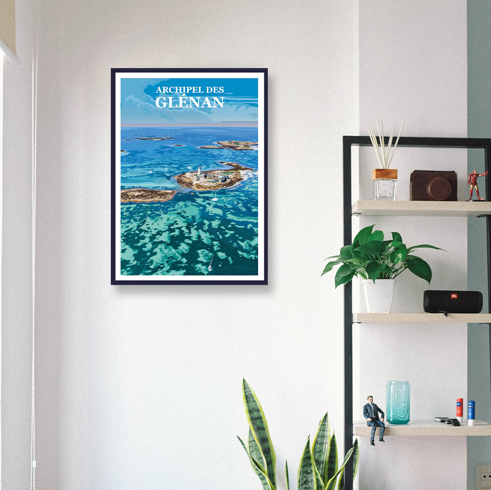 Cette décoration murale est une affiche encadrée qui représente l’Archipel de Glénan.