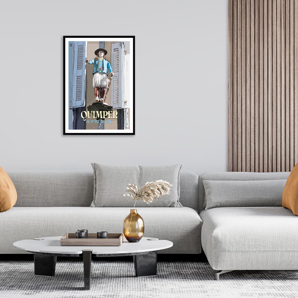 Cette décoration murale est une affiche encadrée qui représente Quimper et son célèbre Petit Glazik.