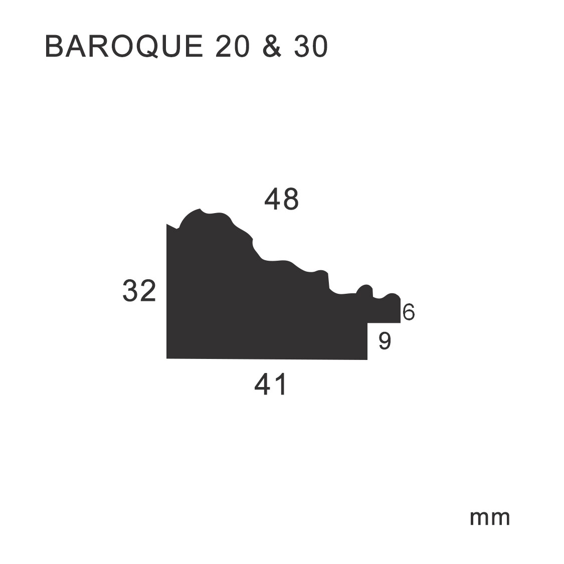 Largeur visible de la baguette: 4.8 cm de chaque côté. Si votre toile fait 40x50cm. La dimension finie sur votre mur du cadre baroque sera 48.5 x 58.5 cm (largeur de la baguette- recouvrement + jeu technique de 3mm)