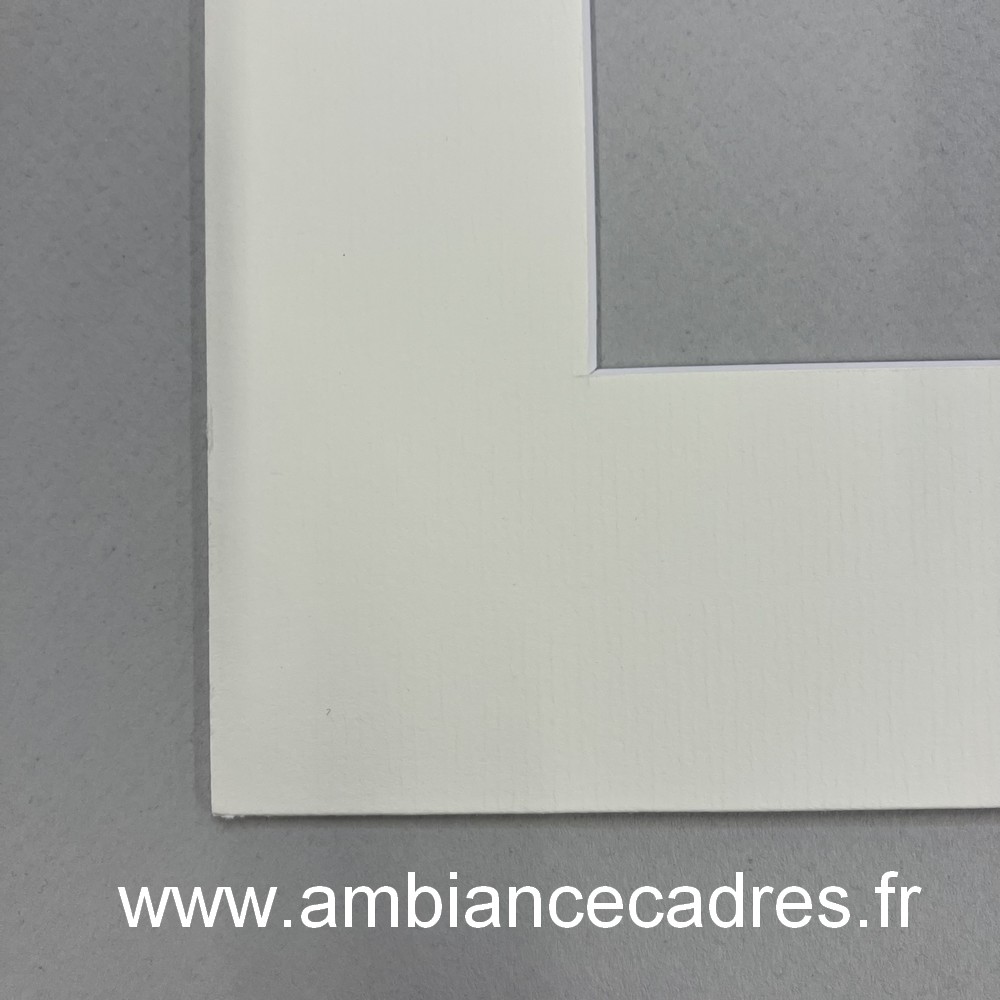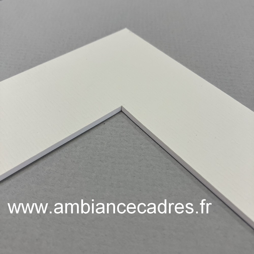 Caractéristique : Passe-partout Blanc Cassé, avec âme blanche (=coupe biseautée blanche ). Epaisseur du carton de 1.3mm, effet tramé ou lisse selon arrivage.